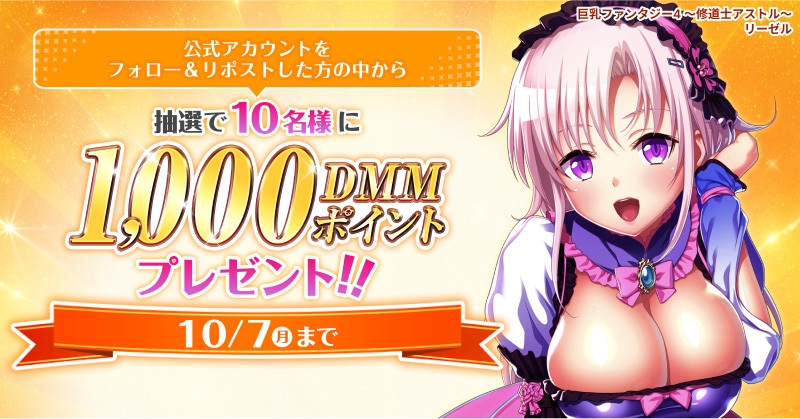 概要:FANZA GAMES公式アカウントをフォロー&リポストしたユーザーの中から抽選で10名様に1,000DMMポイントをプレゼントします。