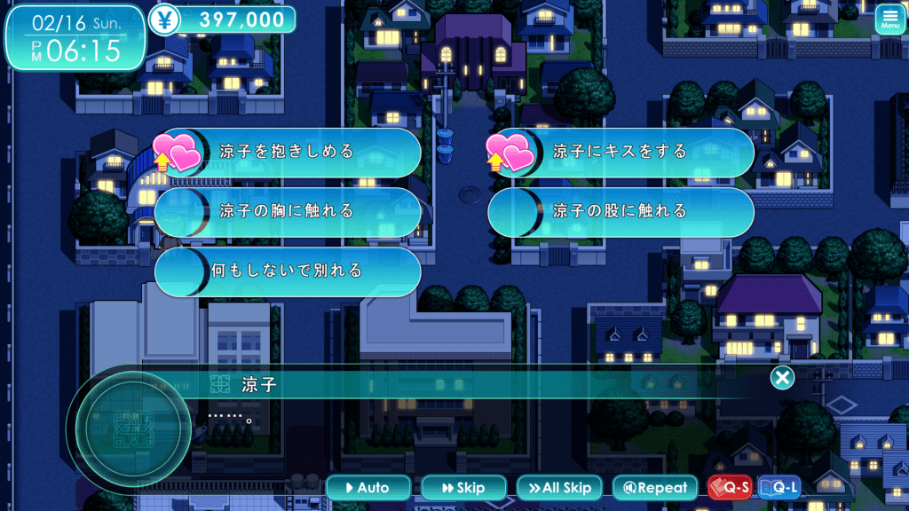 「抱きしめる」「キスをする」「胸に触れる」「股に触れる」という選択肢は、ガードが堅いヒロインからは最初こそ拒否されるが、好感度が高い状態だと受け入れてくれる。その、待ってました感がたまらない。